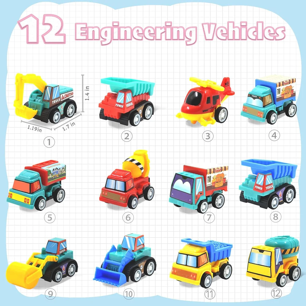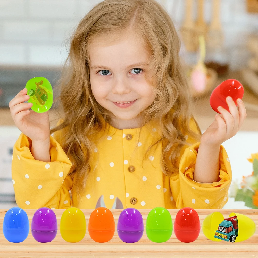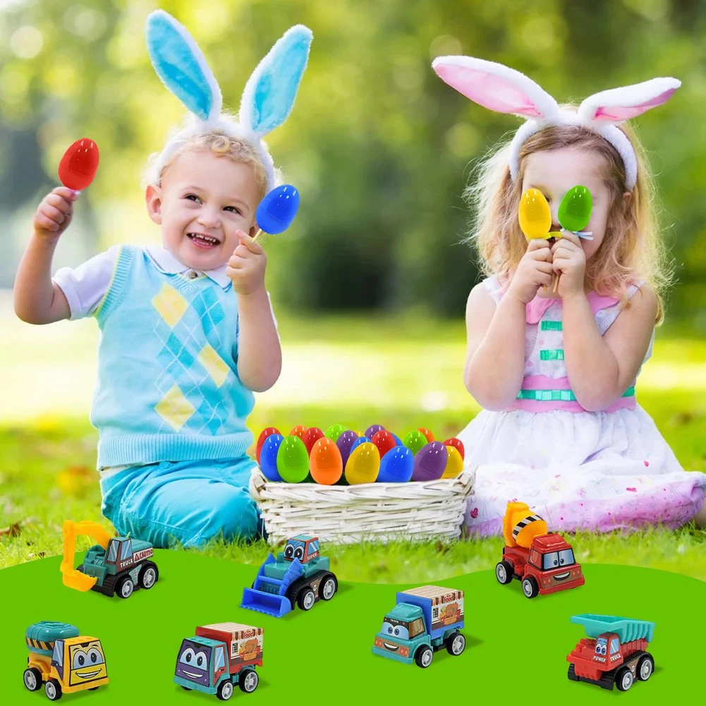 1.Prefilled Easter Eggs with Pull Back Cars: Contains 12 plastic prefilled easter eggs and 12 pull back engineering vehicles. Egg size: 3.14''x1.96'', perfect for children's play or hunts.