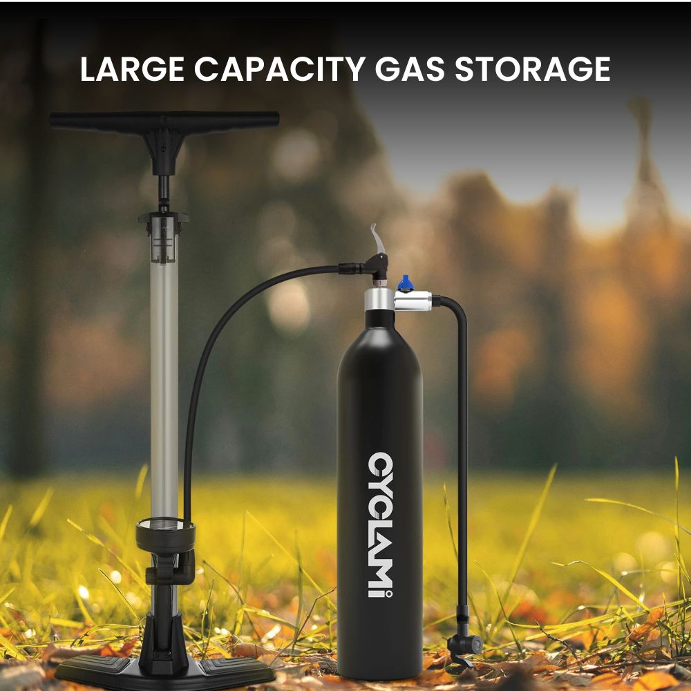 The CYCLAMI 1.3L Tire Booster is designed for fast, high-pressure inflation of tubeless bike tires. Made from durable aluminum alloy with leak-proof valve control.