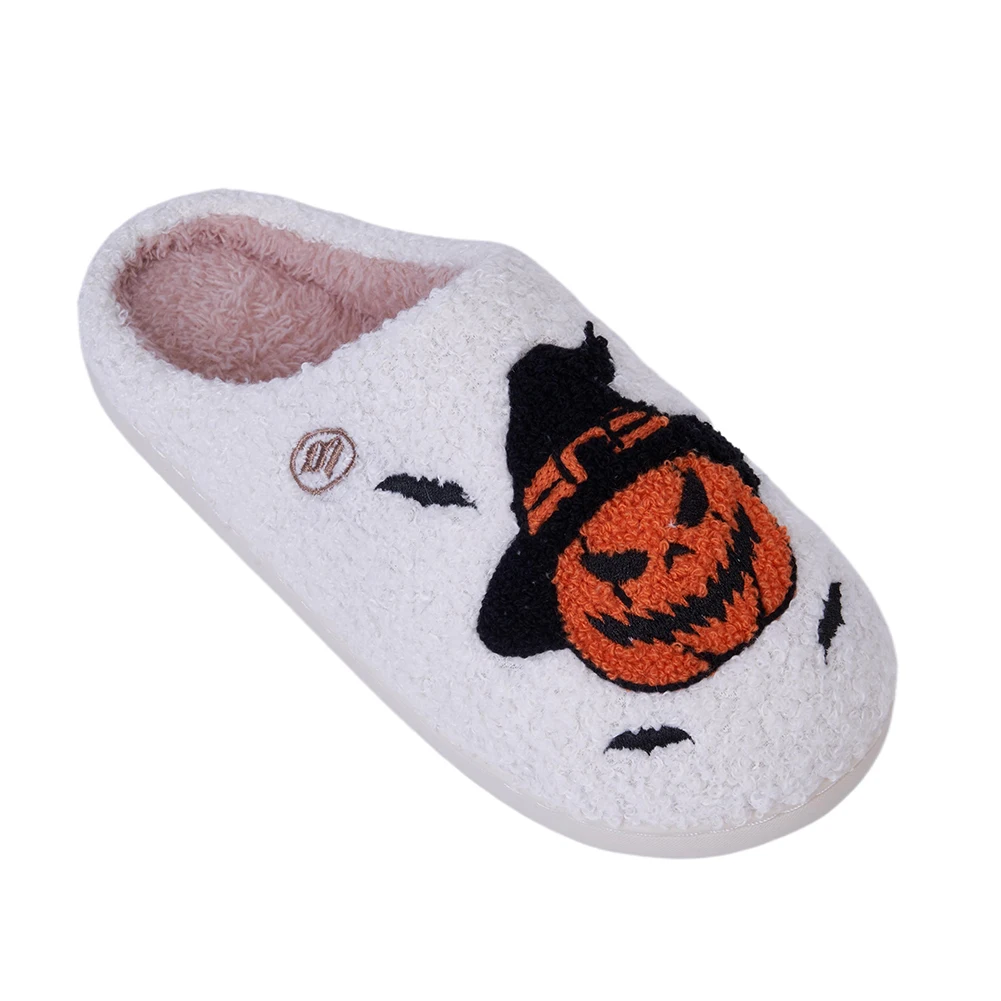 Halloween Pumpkin Slippers Flat Thermal Slippers Anti Slip Fluffy Couple Slippers Fuzzy Witch Hat Pumpkin Slippers for Men Women
