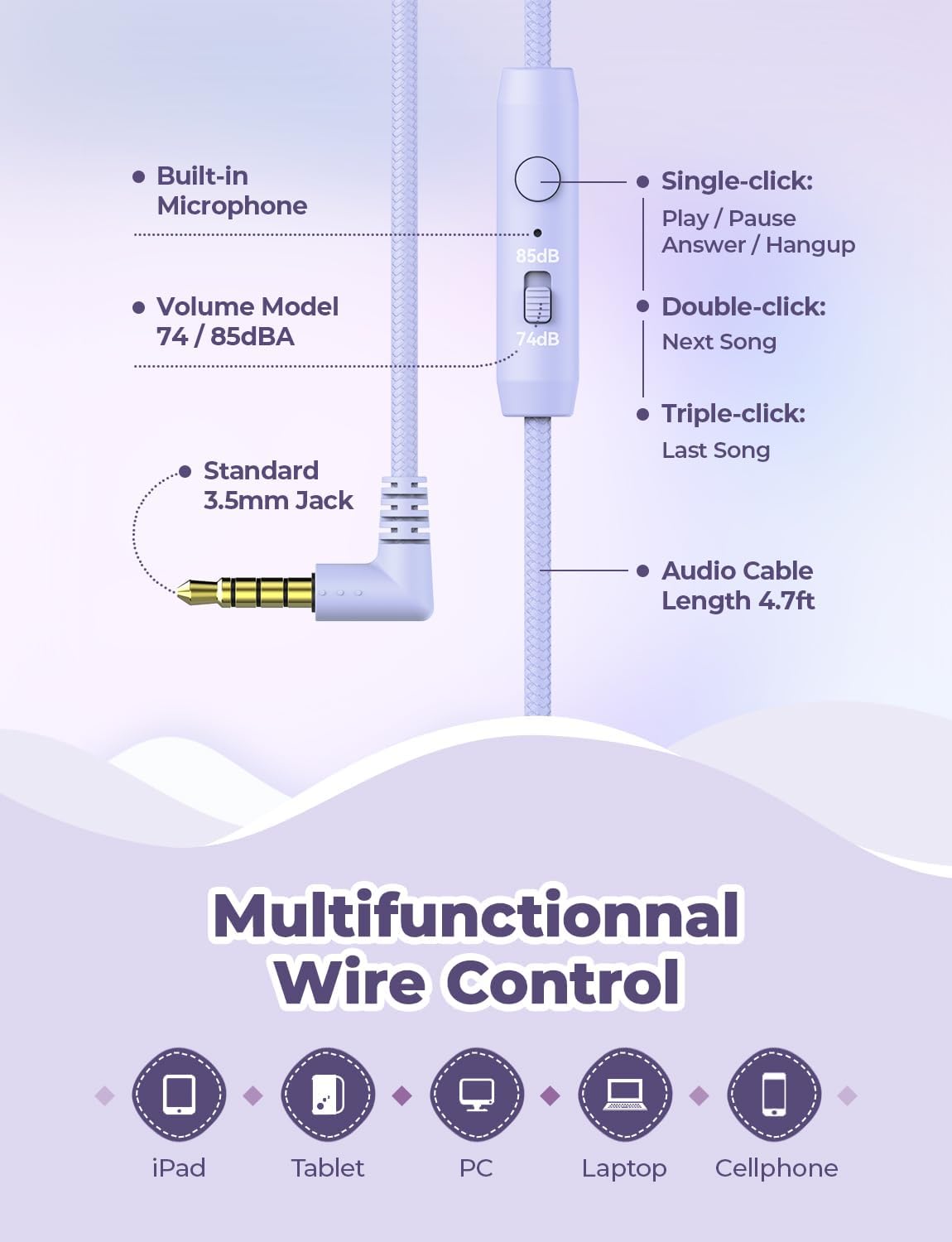 - [Built-in Mic &Great Compatibility]: iClever wired headphones work with the build-in HD microphone for hands-free phone calls. These over-ear headphones for kids support a wide range of devices with 3.5mm audio jack like Chromebook, Kindle Fire, Switch, iPad, Smartphone, MP3/4, Study Tablet, Laptop, PC etc.