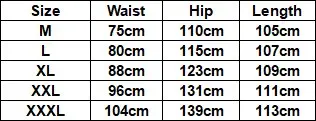 | Size:M | Waist:75cm / 29.53'' | Hip:110cm / 43.31'' | Length:105cm / 41.34'' |