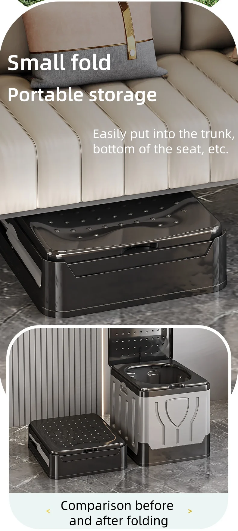 Experience ultimate convenience with this innovative portable folding toilet – the perfect solution for travel, camping, emergencies, and outdoor adventures. Designed with human-centric features, this lightweight car toilet effectively addresses on-the-go sanitation needs without compromising space or comfort.