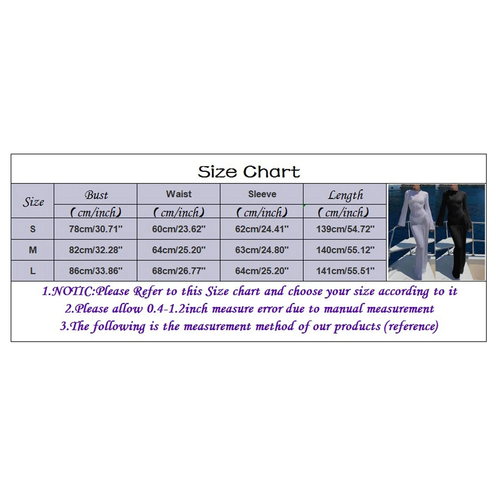 | Size:S | Bust:78cm/30.71'' | Waist:60cm/23.62'' | Sleeve:62cm/24.41'' | Length:139cm/54.72'' |
