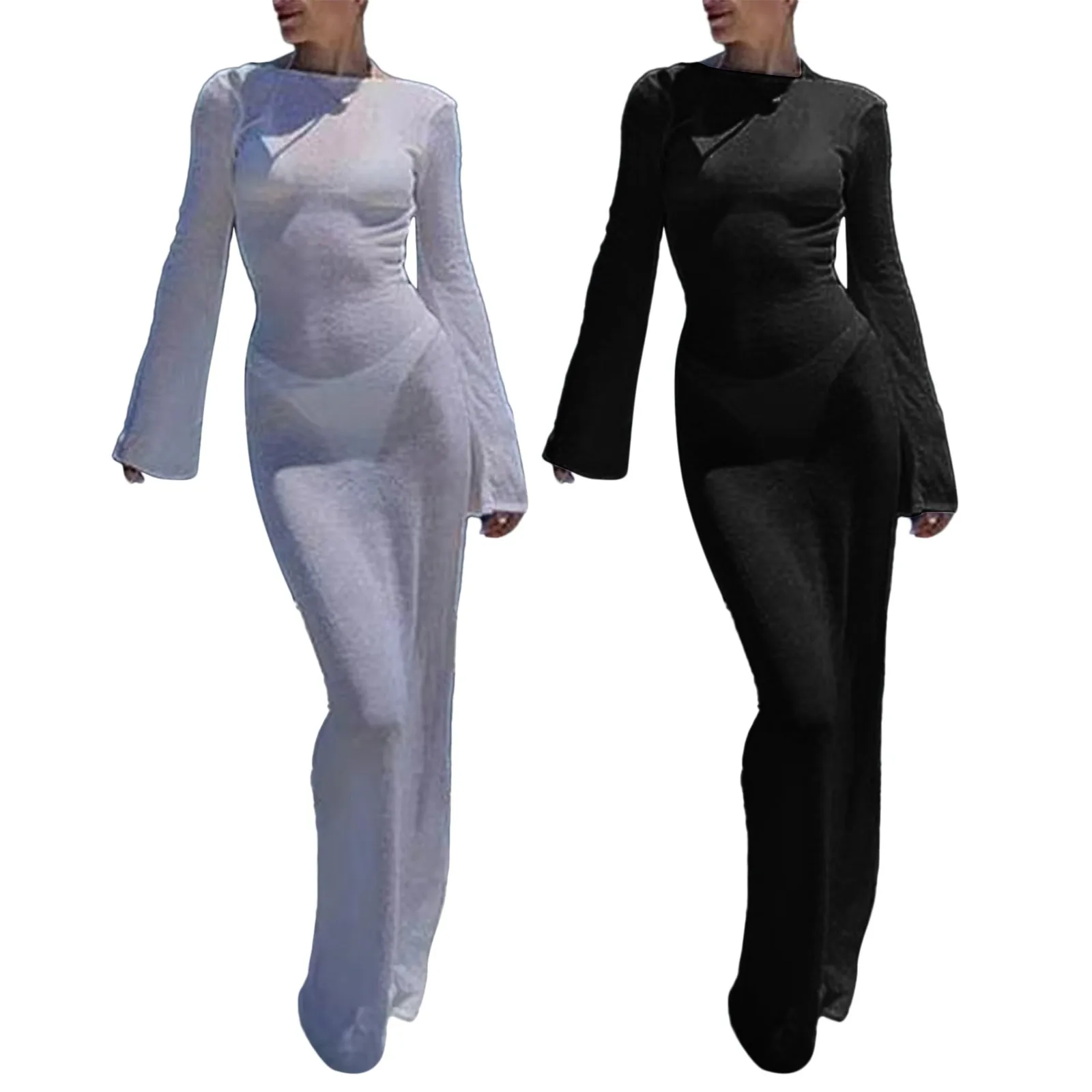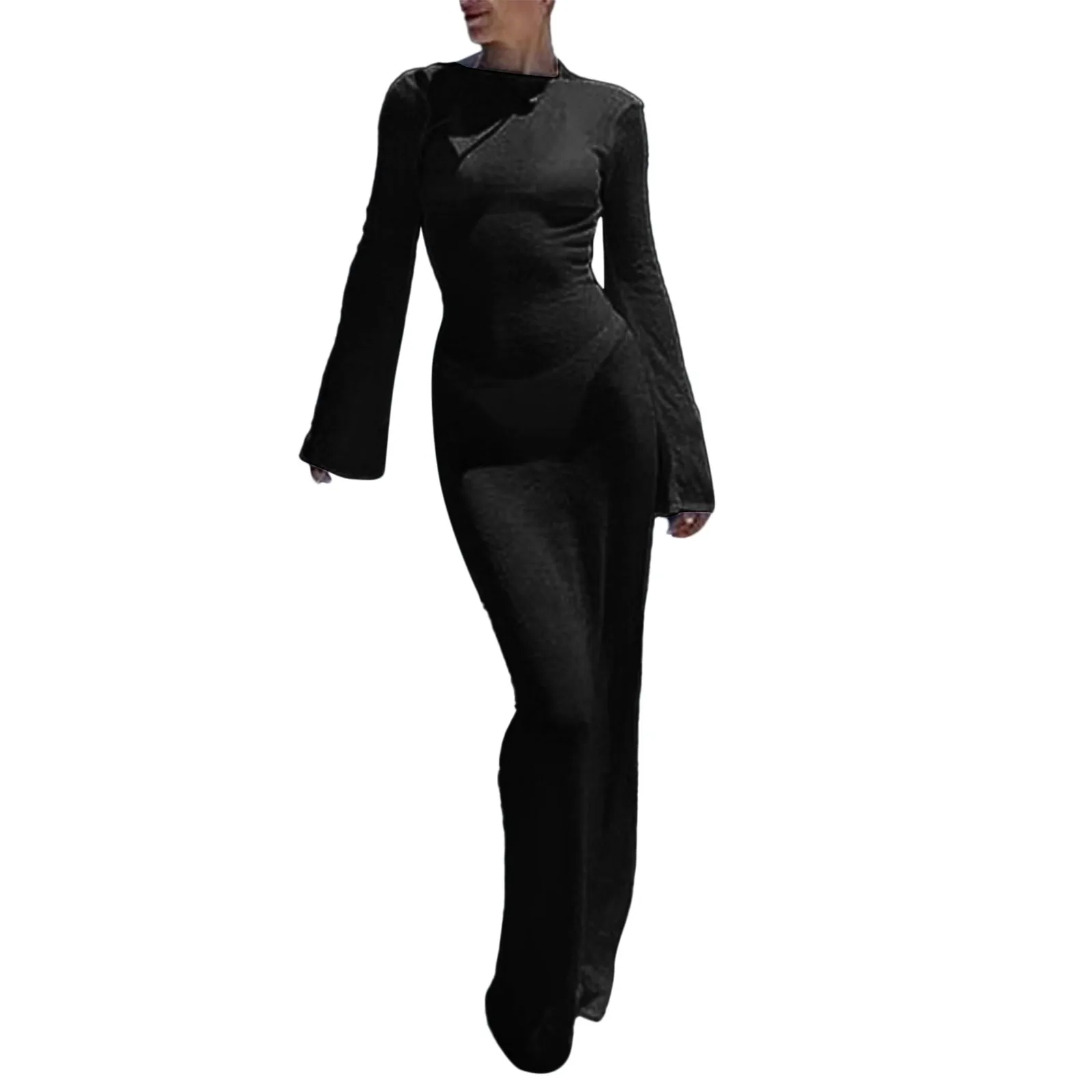Women Casual Solid Dress Long Sleeve Round Neck Backless Dress Flare Sleeve Slim Beach Overskirt Dress