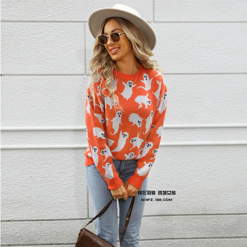 Women Pullover Halloween Sweaters Ghost Print Jumpers Long Sleeves O Neck Loose Slight Strech Casual Office Lady 2025 Autumn