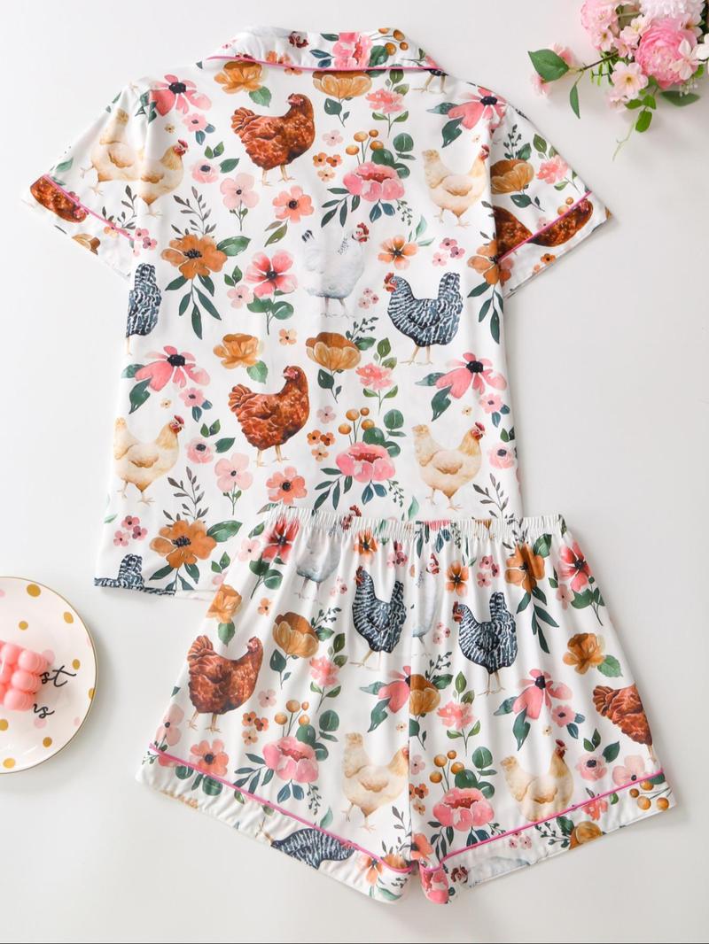Women'S Chicken & Floral Print Button Top & Shorts Pajama Two-Piece Set, Casual Comfy Short Sleeve Top & Shorts Pj Set, Ladies Sleepwear for All Seasons, Sleep Sets